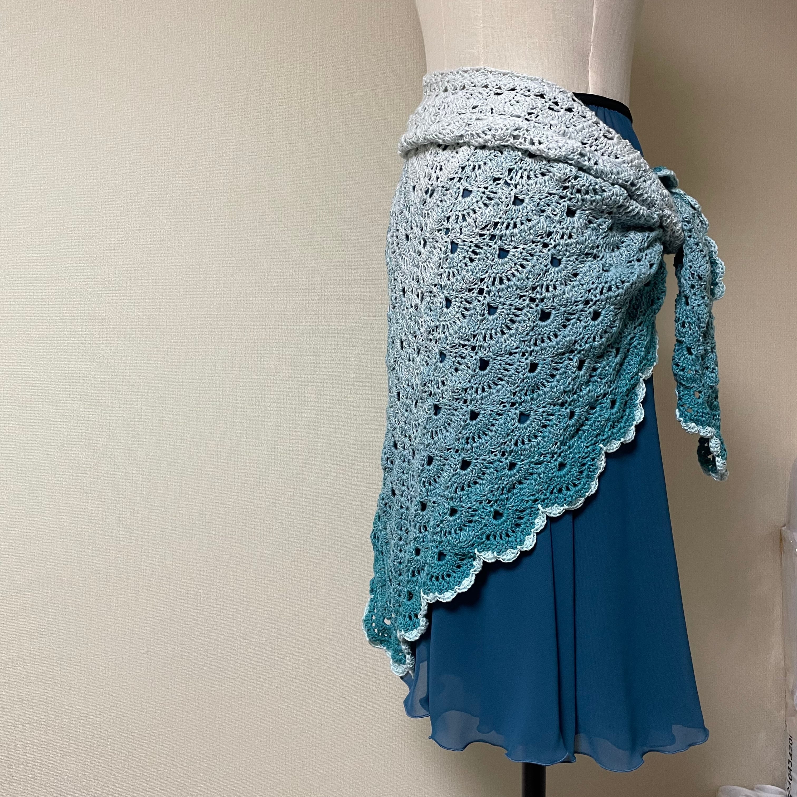 腰に巻いても肩にかけても首に巻いても使える手編みのショール。